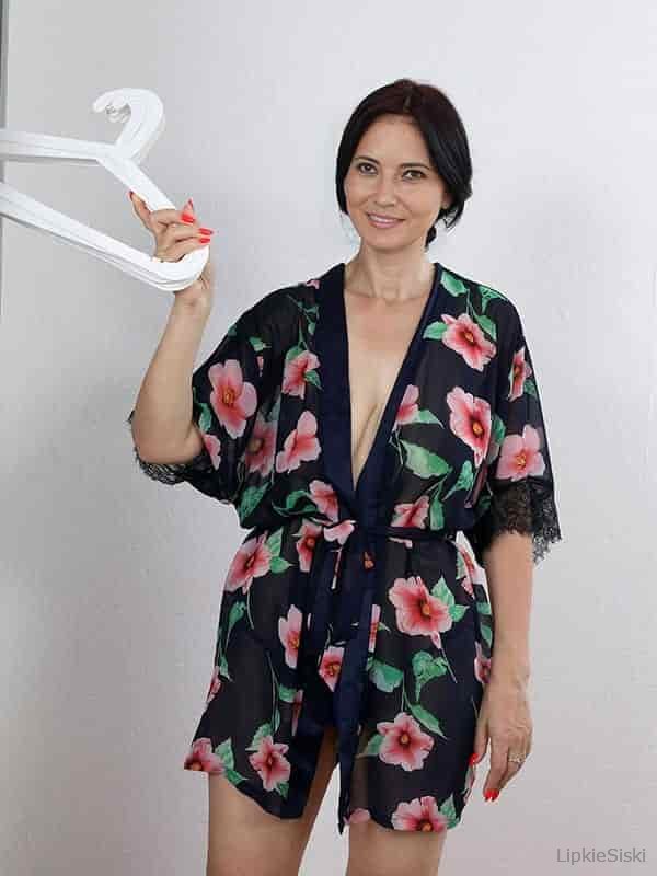 🔥 Зрелая брюнетка снимает халатик и трусики
