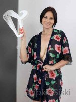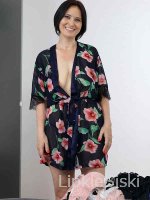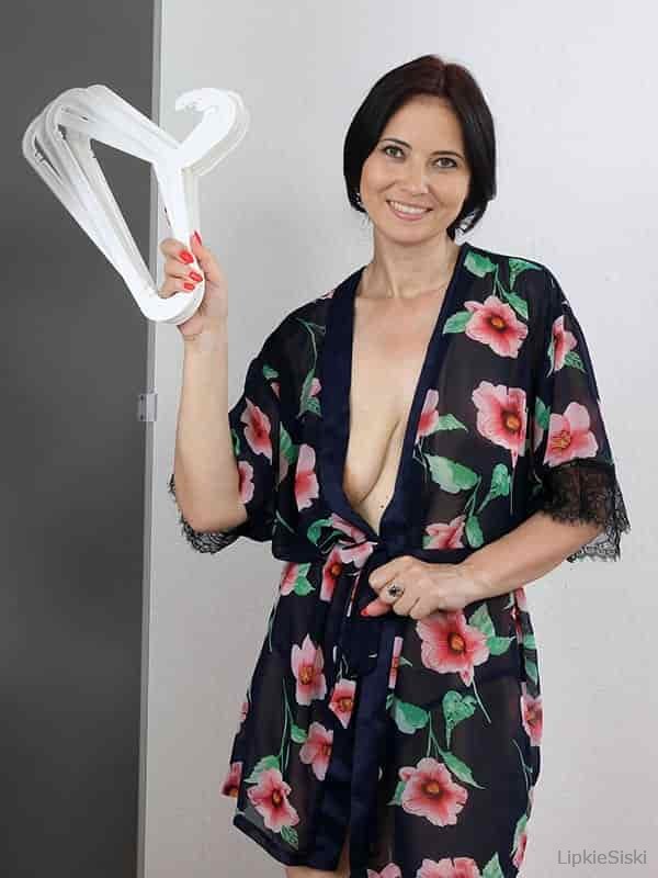 Женщина медленно снимает халатик, оставаясь в одних трусиках, и уверенно демонстрирует натуральную грудь. Она поворачивается к камере, позволяя запечатлеть висячую, но пышную грудь с крупными сосочками. Позы сменяются: от стоячей с лёгким наклоном до сидячей на кровати, где она слегка раздвигает ноги, показывая пушок небритой киски. Её движения спокойные, с лёгкой улыбкой, передающей уверенность и раскованность. Съёмка от первого лица добавляет кадрам ощущения близости и искренности.
