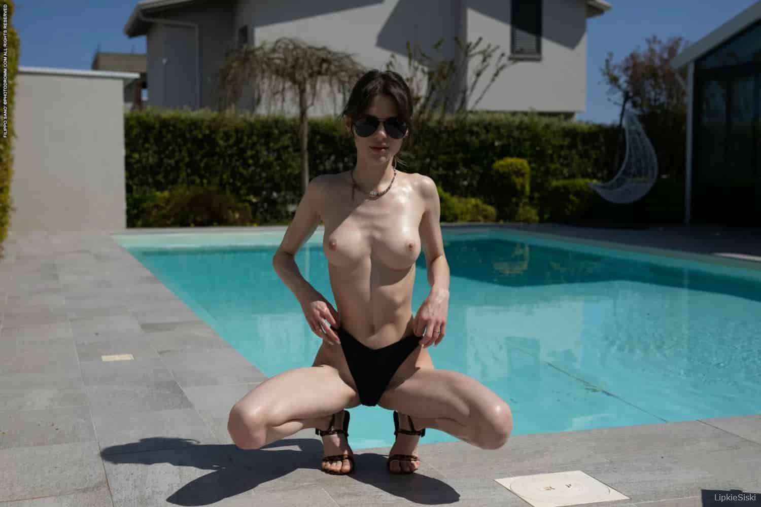 Худая красотка без бикини у бассейна