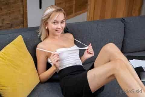 Стройная блондинка устроилась на мягком диване и медленно начала раздеваться. Сначала она расстёгивает блузку, открывая вид на свою красивую грудь. Её движения неторопливы и полны женственности, словно она играет с камерой и зрителем, приглашая нас рассмотреть каждую деталь её тела.